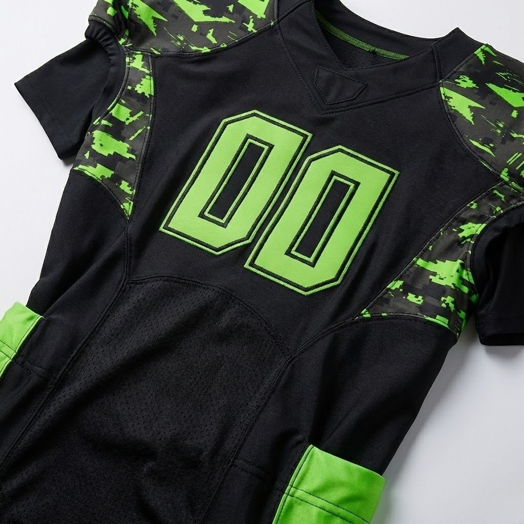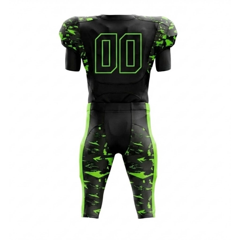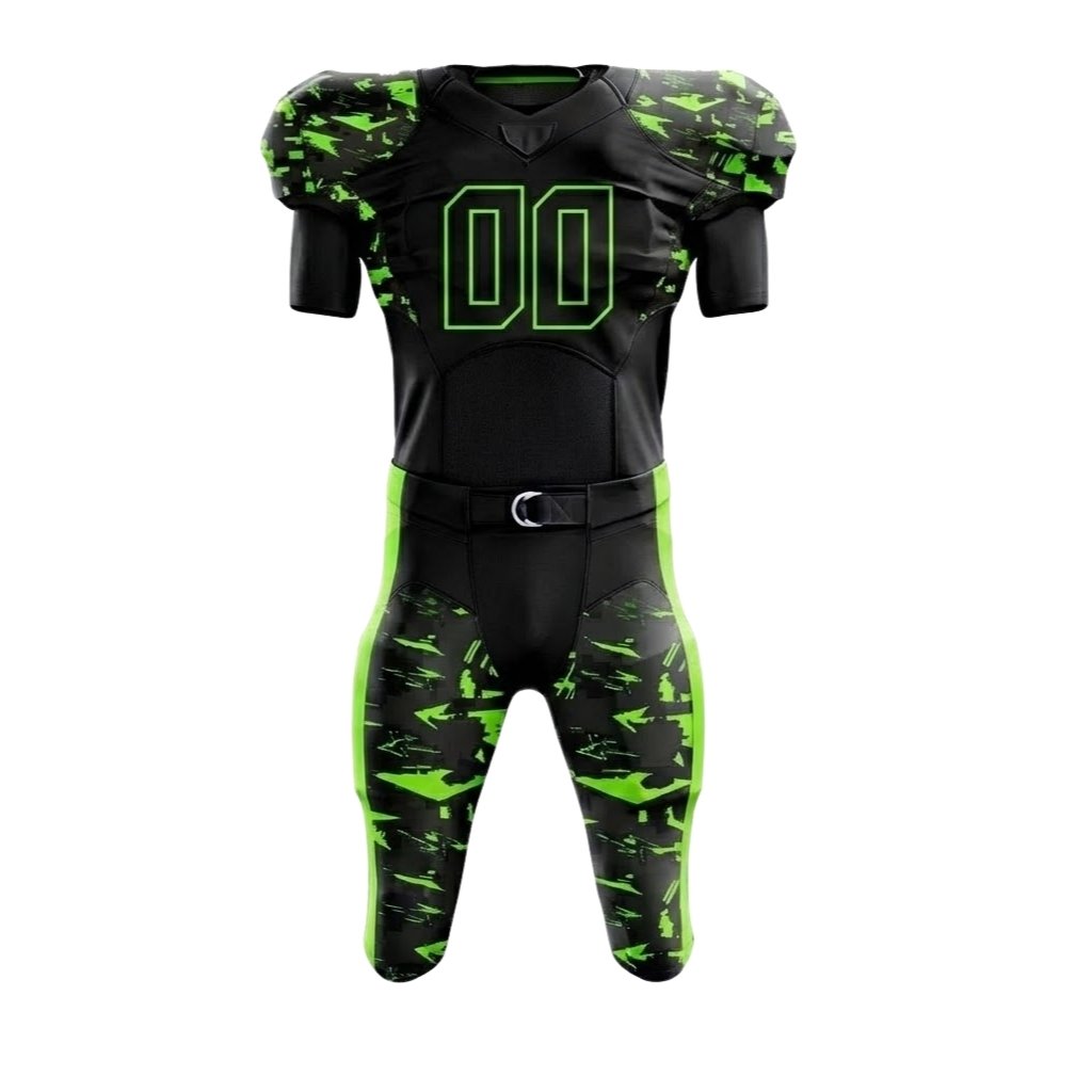 This uniform features a black base with neon green digital camouflage patterns, delivering an aggressive and modern look on the field. Manufactured using premium stretch polyester with breathable mesh zones, the uniform provides excellent flexibility, moisture control, and durability for high-contact sports.